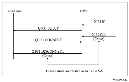 Figures II.8 through II.16 show example conditions when cause mappings would be utilized between Q.931 and X.25messages and utilize the specific mappings of Table 6-5 and Table 6-6 as shown below.